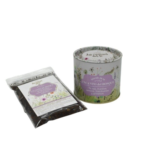Encanto del Bosque es un blend dulce, vibrante y apasionado, elaborado con té rojo, frambuesas, grosellas, cerezas y frutillas.