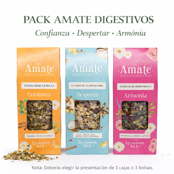 El Pack Amate Digestivos reúne 3 mezclas especialmente seleccionadas para acompañar el sistema digestivo, aliviar la pesadez y disfrutar del mate de forma más suave y equilibrada.